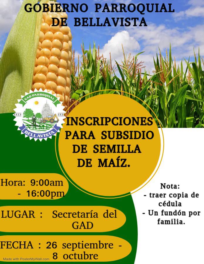 ¡Inscríbete y recibe tu kit de semillas de maíz subsidiado! El GAD de la parroquia de Bellavista invita a los agricultores locales a participar en el proyecto de entrega de